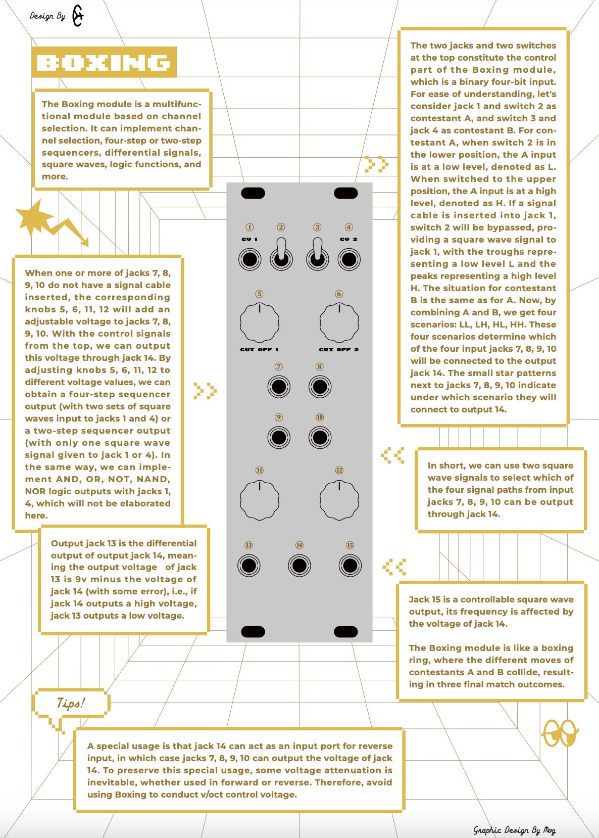 The Boxing module is a multifunctional module based on channel selection. It can implement channel selection, four-step or two-step sequencers, differential signals, square waves, logic functions, and more.