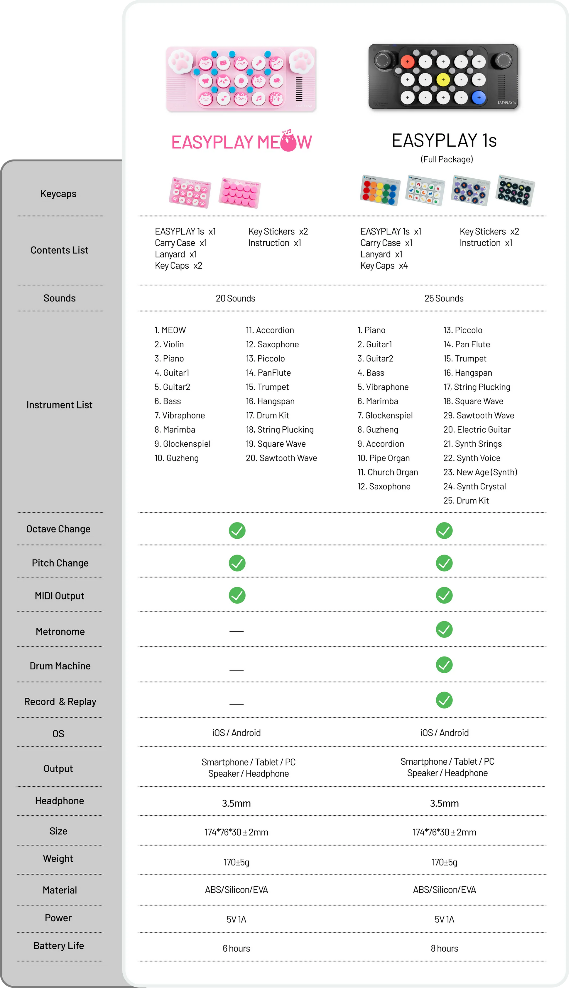 Make your performances even more fun! The EASYPLAY 1s keyboard caps are customizable. Use the included custom caps and stickers to create your very own unique EASYPLAY 1s.