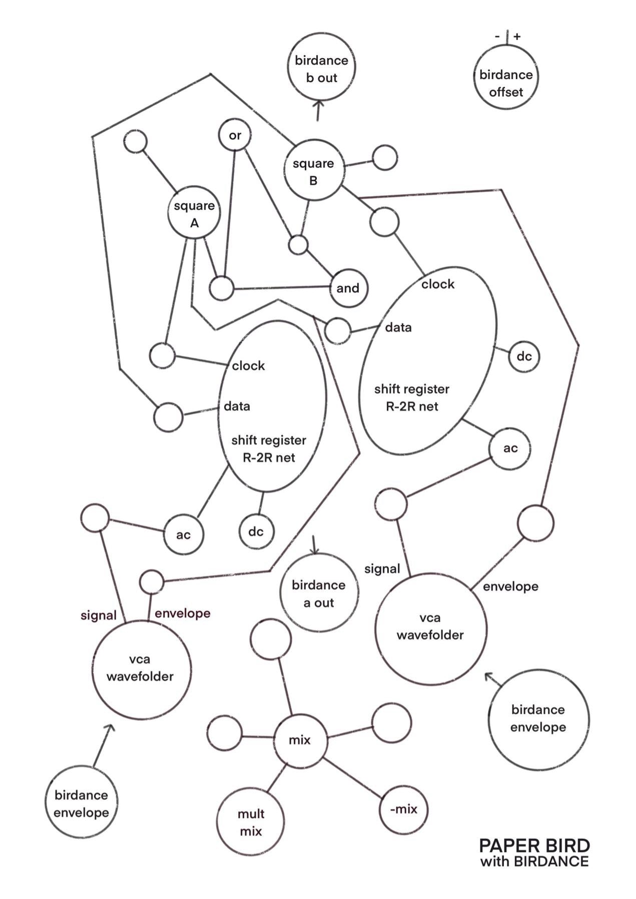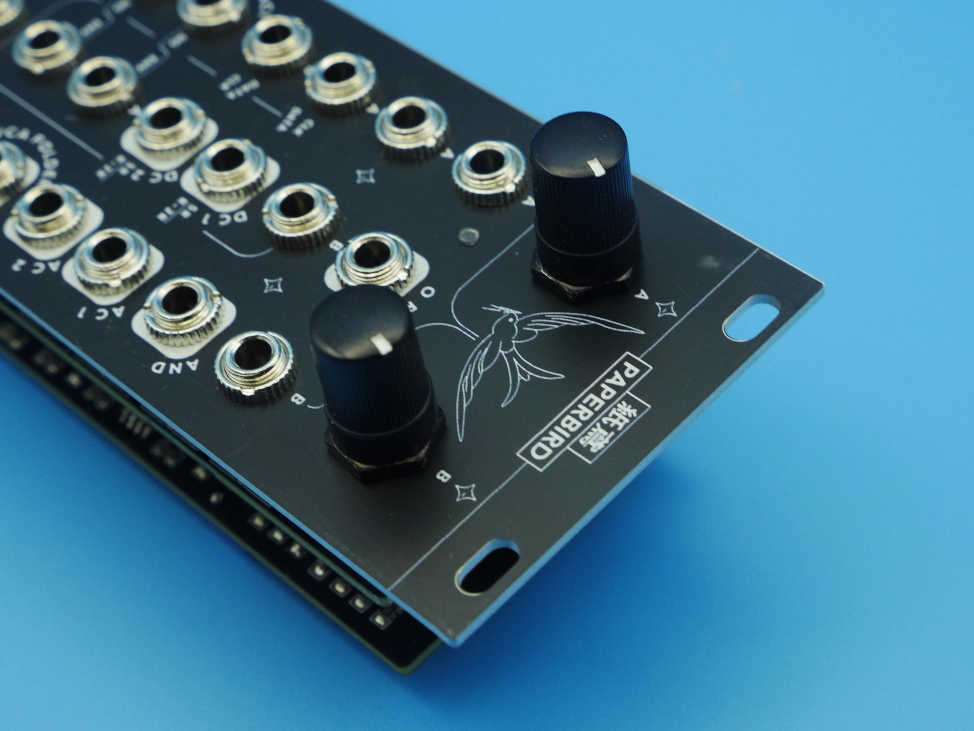 Paperbird is a versatile utility module built around two square-wave generators that cross-modulate to unlock a wide range of functions. Each function can also process external signals by patching into the corresponding jacks, replacing the internal square waves.