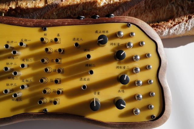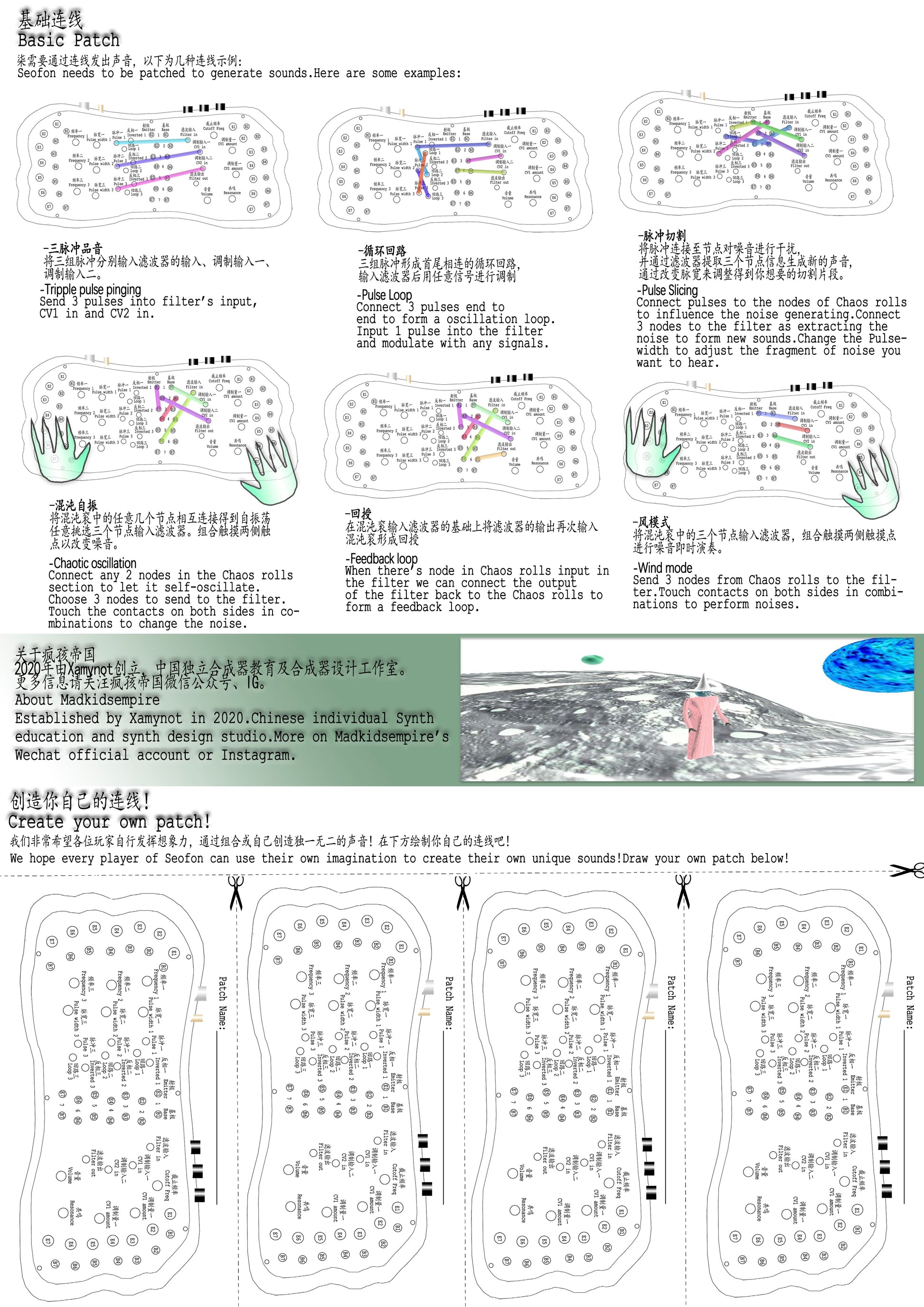 At the heart of Seofon is an organic noise generation circuit consisting of seven nodes in the centre, which outputs noise directly and generates rhythms by feeding signals to the nodes to interfere with them. Seofon itself provides three sets of pulse oscillators to adjust the pulse width of each set, and positive and negative phase outputs. Different sound events are generated by extracting information from the nodes into the filter. All sounds originate from the interference and extraction of noise signals from the seven sets of nodes. The synthesiser package and circuitry was designed by Mad Kids Empire synthesiser designer xamynot; the painted artwork on the back of the synthesiser was drawn from artist Yu Zhi.